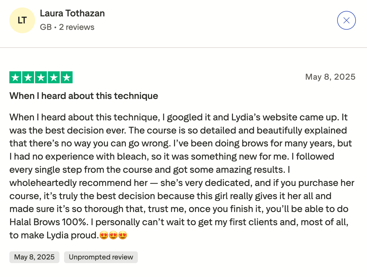 The Halal Brow Mastery helps beauty artists attract new clients and boost their bookings thanks to brows. Learn the full halal brow method from mapping to bleaching and grow your business with confidence and purpose.